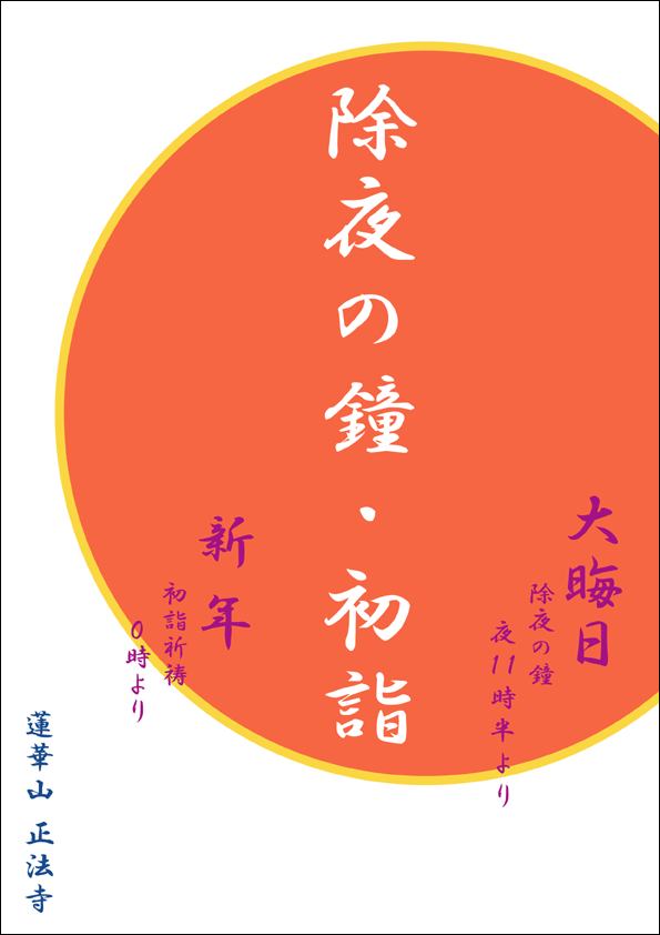 本年も除夜の鐘・新年初祈祷を厳修いたします。皆様の参詣をお待ちしています。鐘とともに一年の溜まった煩悩を打ち落として、新しい年の初頭にあたり、神仏に自己や家族の隆昌を祈願し、令和8年の幸運を迎えましょう。正法寺では、人数の制限なく、参詣者全員が除夜の鐘、初祈祷が受けられます。御家族や友人お誘い合わせの上、御参詣ください。